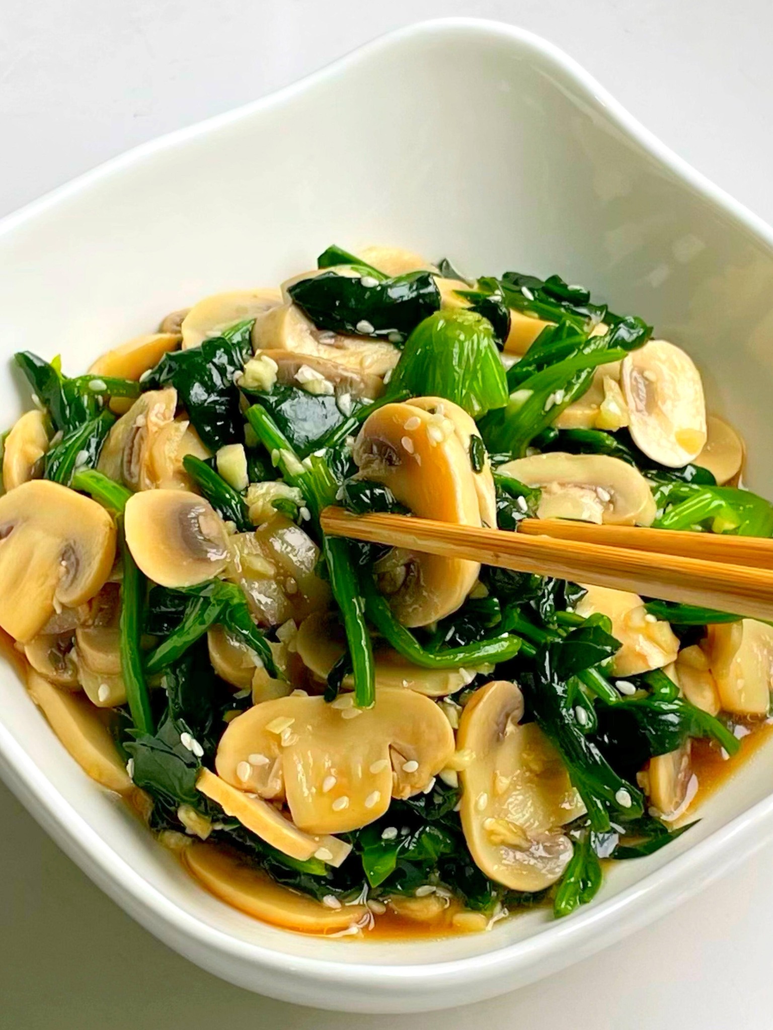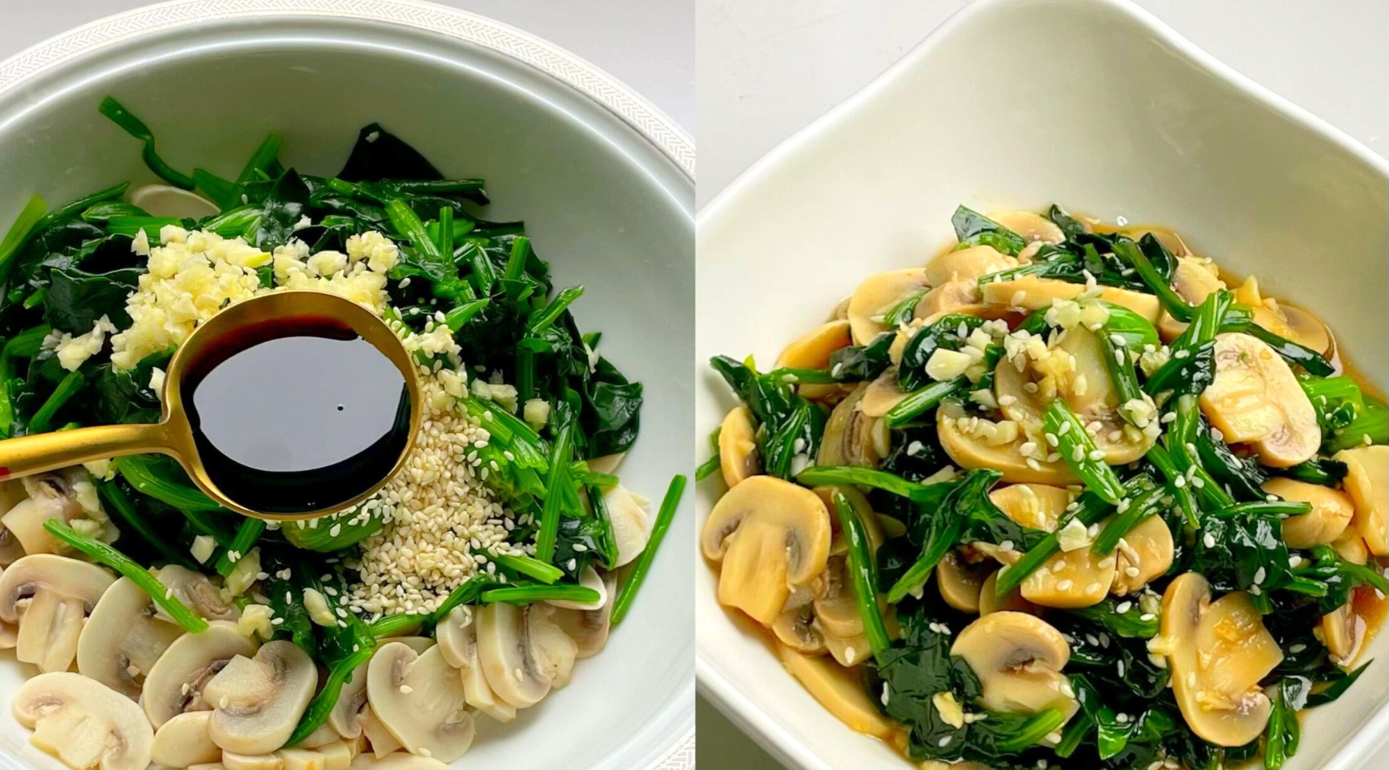 200g rau bina, 300g nấm mỡ, 3 tép tỏi băm nhỏ, 2 thìa canh nước tương, một ít hạt mè trắng rang, 1 thìa canh dầu mè, một chút xíu muối, một chút giấm balsamic.