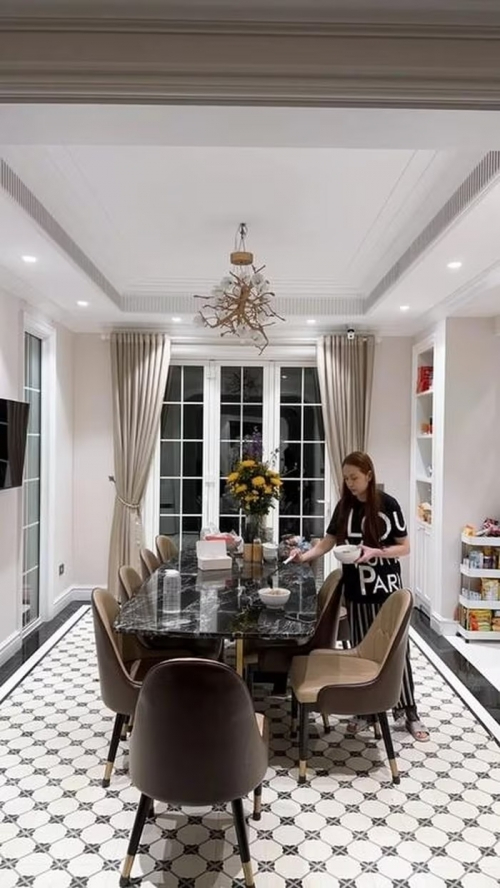 Bên trong nhà, khu vực phòng ăn là một trong những không gian nổi bật nhờ cách bài trí sang chảnh và chỉn chu. Nội thất ở đây mang tinh thần cao cấp, phù hợp với tổng thể tân cổ điển của căn biệt thự. Không gian rộng rãi, sáng sủa và được sắp đặt gọn gàng giúp nơi này vừa có tính thẩm mỹ, vừa giữ được cảm giác ấm cúng đúng nghĩa của một căn nhà có đông thành viên.